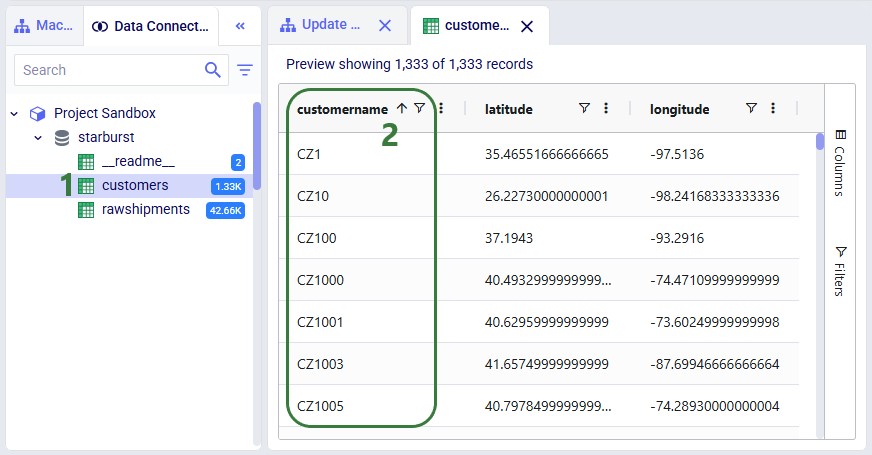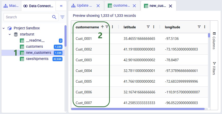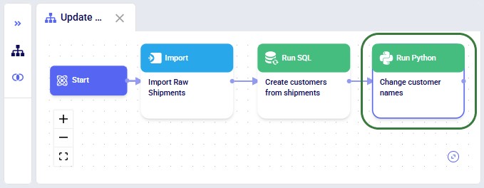 This walkthrough uses the end state of the DataStar Quick Start: Creating a Task using Natural Language guide as a starting point. At that point, a raw_shipments table has been imported and a Run SQL task has produced a customers table with unique customers. We will use a Run Python task to transform customer names from the format CZ1, CZ10, CZ100 to Cust_0001, Cust_0010, Cust_0100 - ensuring alphabetical sort matches customer number order and aligning the prefix with other data sources. The transformation steps are: