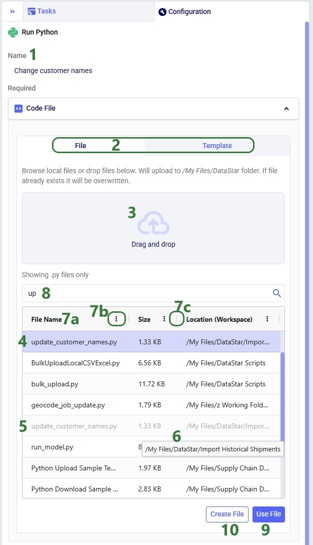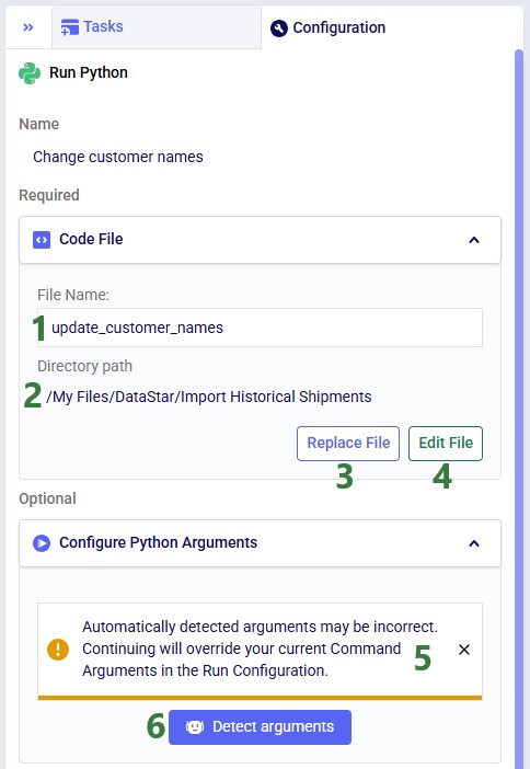 After clicking Use File with update_customer_names.py selected, the configuration updates as follows: