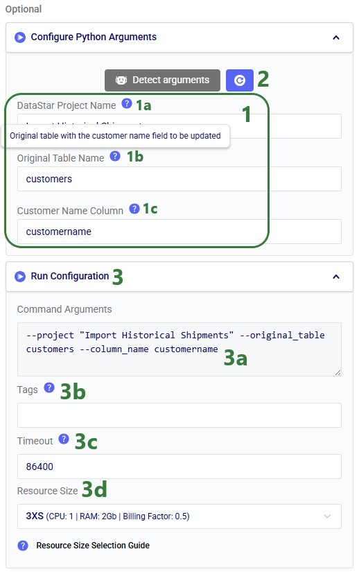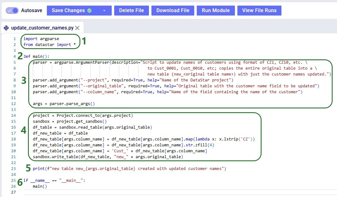 Before configuring arguments, we will cover the update_customer_names.py script. We can review its arguments so we can verify auto-detection is correct and look at the script body to understand what it does. You can copy the full script text from the Appendix.