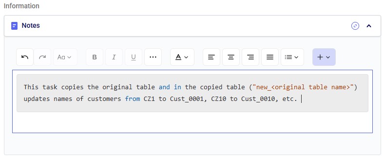 The Notes section is the final configuration area. It is especially valuable for complex tasks or collaborative projects, enabling users to quickly understand what the task does. Formatting options are available above the text box: