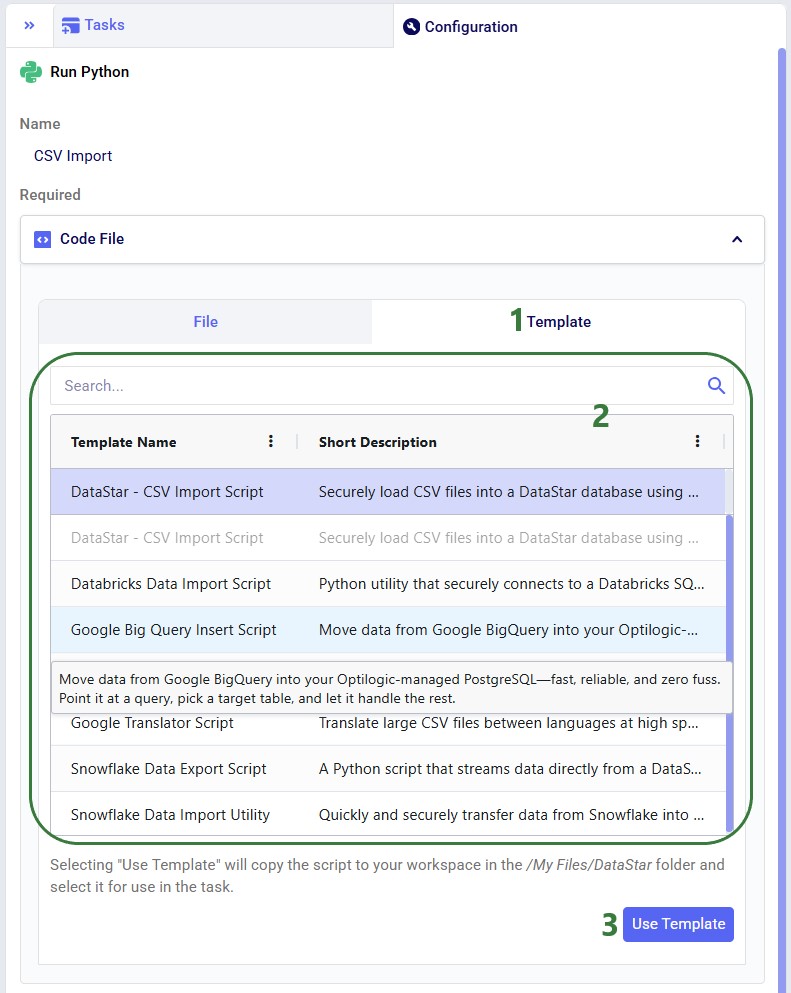 Templates are pre-built scripts available to all users from the Resource Library, covering common import/export patterns. To browse them, open the Resource Library application, filter for DataStar resources (button at the right top) and the Script tag. Clicking a resource also shows available documentation, which can be copied to your Optilogic account or downloaded.