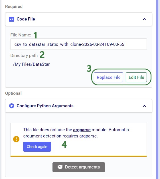 The Run Python task allows you to execute Python scripts within a DataStar macro. You select a script, define its inputs (arguments), and run it as part of your workflow. This is ideal when built-in tasks are insufficient or when you want to reuse existing Python logic.