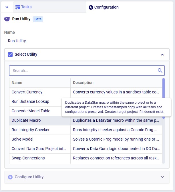 Once an Agent/Utility has been selected by clicking on it, the Configure Utility section becomes available. The inputs here will differ based on the Agent/Utility that has been selected. In the next screenshot the Configure Utility section of the Duplicate Macro utility is shown: