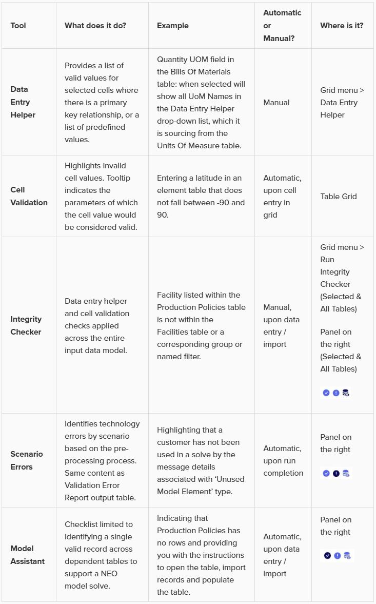 There are additional tools in Cosmic Frog which can help with finding problems in the model’s data and overall construction, the table below gives an overview of how these tools compare to each other to help users choose the most suitable one for their situation: