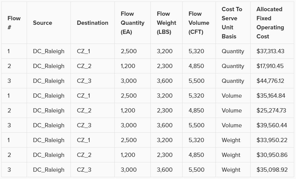 User can select Quantity, Volume, or Weight. This basis is used when needing to allocate costs based on amounts of product (e.g. amount produced or moved). For example, we need to allocate $100,000 fixed operating cost at DC_Raleigh to 3 outbound flows. The result is different when we use a different cost to serve unit basis: