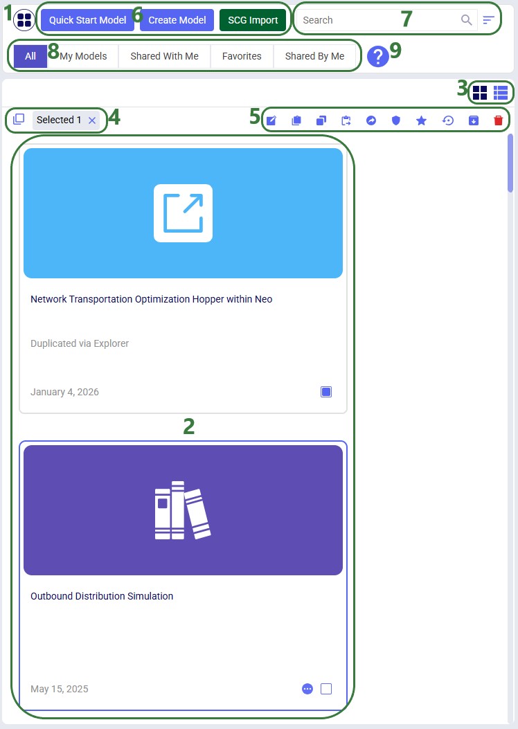 The Model Manager in Cosmic Frog is the central place to create, view, organize, and maintain your supply chain models. It provides tools for quickly finding models, understanding their status, and performing common management actions such as editing, duplicating, and deleting models.