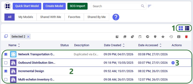 The same as for card view, all model management actions are available from the toolbar if only 1 model is selected, if more than 1 model is selected, only the Delete option will be available.
