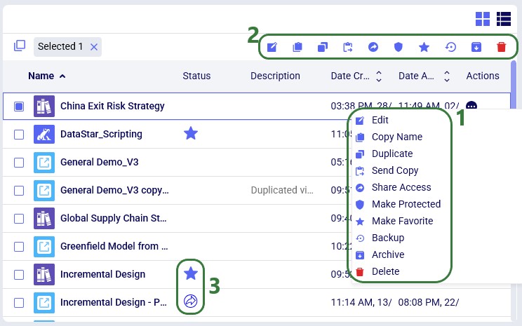 Favorites - users can mark models as a favorite, for example those that are accessed often, and this filter will show only those models marked as favorite. This filter is currently applied as is indicated by the blue background color of the filter. These favorite models have a star icon in their Status column (list view) or at the right top in their card (card view).
