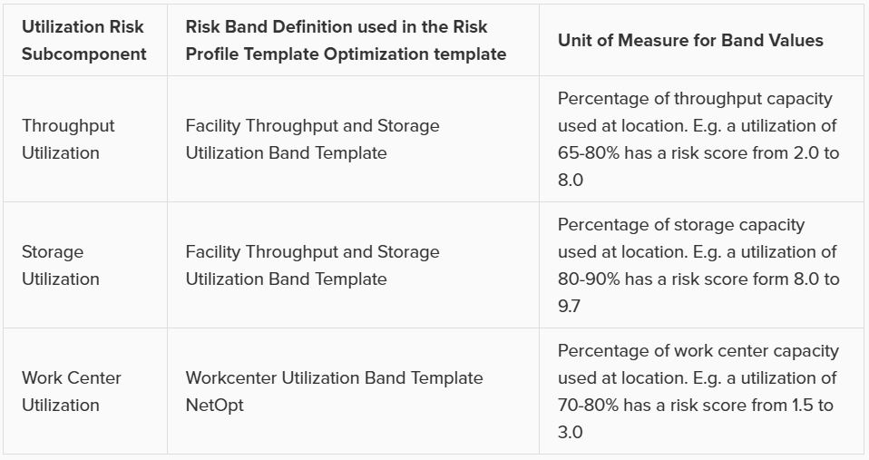 Similar to the Geographic Risk component, the Utilization Risk component also has its own table, Utilization Risk Configurations, where its 3 risk subcomponents are configured. Again, each of the subcomponents has a Risk Weight field and a Risk Band field associated with it. The following table summarizes the names of the Band Definitions used for these utilization risk subcomponents and what the unit of measure is for the Band Values with an example: