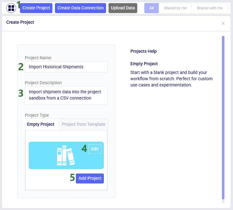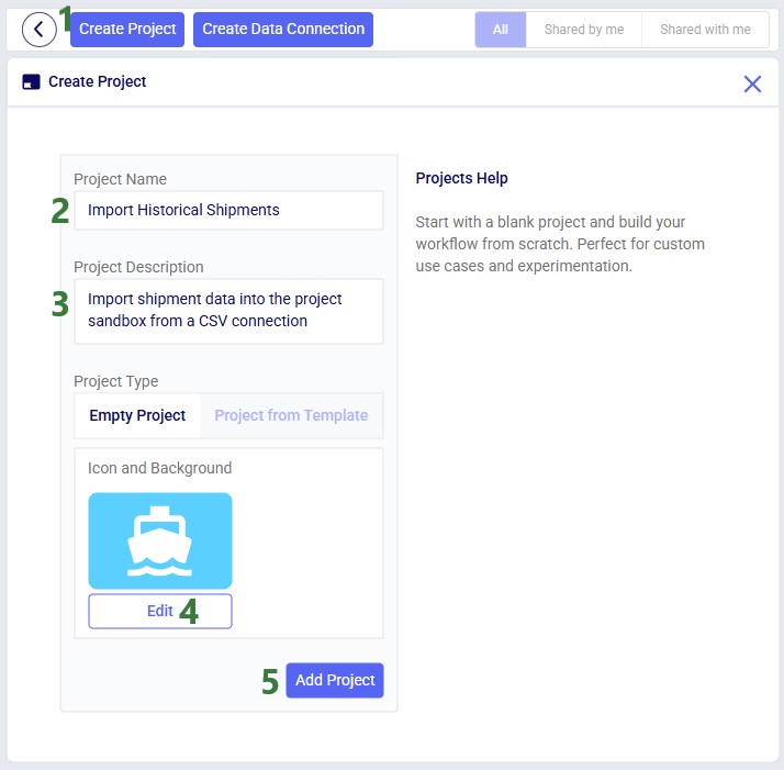 You can either go into an existing DataStar project or create a new one to set up a Macro that will import the data from the Historical Shipments CSV connection we just set up. For this example, we create a new project by clicking on the Create Project button in the toolbar at the top when on the start page of DataStar. Enter the name for the project, optionally add a description, change the appearance of the project if desired by clicking on the Edit button, and then click on the Add Project button: