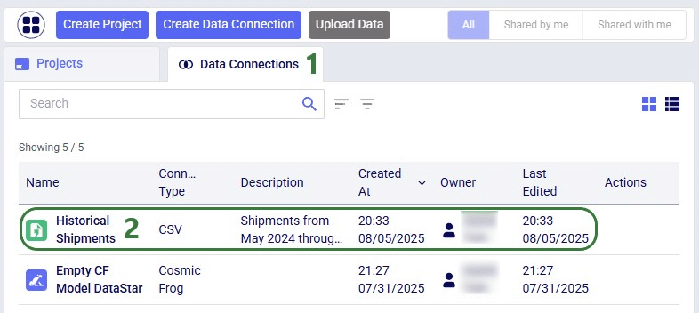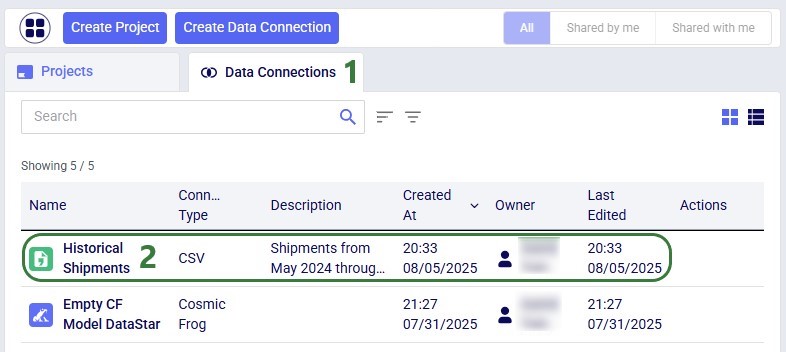 After creating the connection, the Data Connections tab on the DataStar start page will be active, and it shows the newly added CSV connection at the top of the list (note the connections list is shown in list view here; the other option is card view):