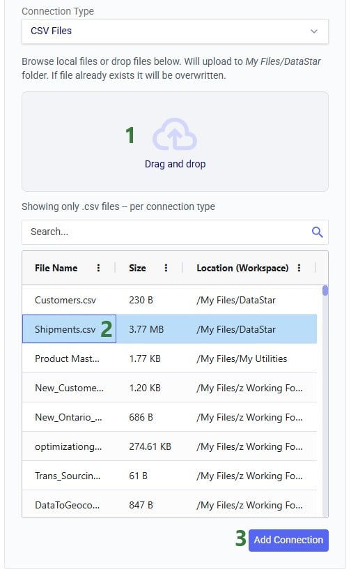 If your CSV file is not yet on the Optilogic platform, you can drag and drop it onto the “Drag and drop” area of the form to upload it to the /My Files/DataStar folder. If it is already on the Optilogic platform or after uploading it through the drag and drop option, you can select it in the list of CSV files. Note that you can filter this list by typing in the Search box to quickly find the desired file. Once the file is selected, clicking on the Add Connection button will create the CSV connection: