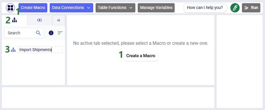 Connect the Import Raw Shipments task to the Start task by clicking on the connection point in the middle of the right edge of the Start task, holding the mouse down and dragging the connection line to the connection point in the middle of the left edge of the Import Raw Shipments task. Next, we can test the macro that has been set up so far by running it: either click on the Run button all the way to the right in the toolbar at the top of DataStar or click on the Run button in the Logs tab at the bottom of the macro canvas.