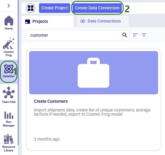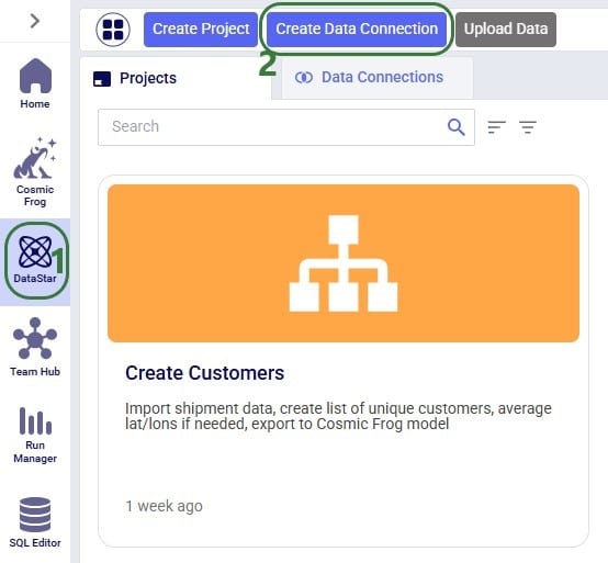 Open the DataStar application on the Optilogic platform and click on the Create Data Connection button in the toolbar at the top: