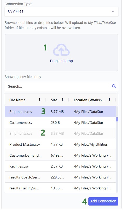 If your CSV file is not yet on the Optilogic platform, you can drag and drop it onto the “Drag and drop” area of the form to upload it to the /My Files/DataStar folder. If it is already on the Optilogic platform or after uploading it through the drag and drop option, you can select it in the list of CSV files. Once selected it becomes greyed out in the list to indicate it is the file being used; it is also pinned at the top of the list with darker background shade so users know without scrolling which file is selected. Note that you can filter this list by typing in the Search box to quickly find the desired file. Once the file is selected, clicking on the Add Connection button will create the CSV connection: