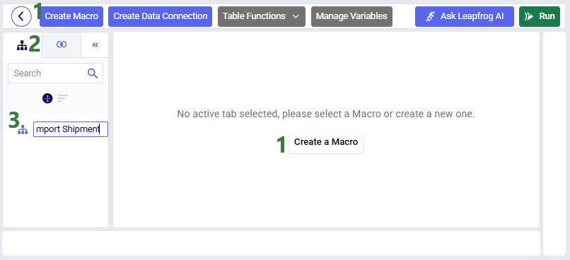 After the project is created, the Projects tab will be shown on the DataStar start page. Click on the newly created project to open it in DataStar. Inside DataStar, you can either click on the Create Macro button in the toolbar at the top or the Create a Macro button in the center part of the application (the Macro Canvas) to create a new macro which will then be listed in the Macros tab in the left-hand side panel. Type the name for the macro into the textbox: