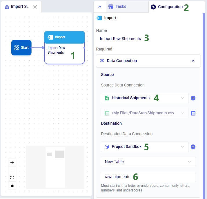 When hovering close to the Start task, it will be suggested to connect the new Import task to the Start task. Dropping the Import task here will create the connecting line between the 2 tasks automatically. Once the Import task is placed on the macro canvas, the Configuration tab in the right-hand side panel will be opened. Here users can enter the name for the task, select the data connection that is the source for the import (the Historical Shipments CSV connection), and the data connection that is the destination of the import (a new table named “rawshipments” in the Project Sandbox):