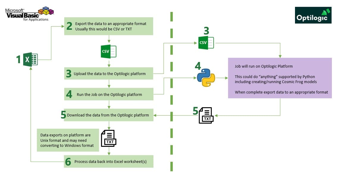 The following screenshot shows at a high-level what happens when a typical Cosmic Frog for Excel App is used. The left side represents what happens in Excel, and on the right side what happens on the Optilogic platform.