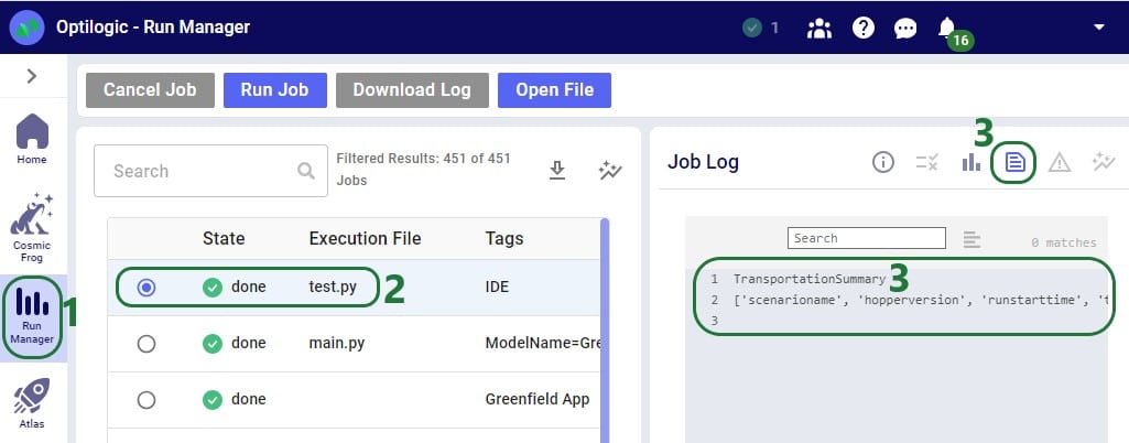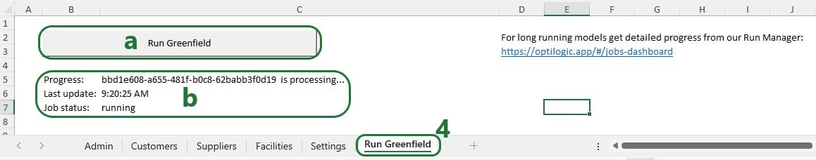 When the greenfield_job.py file starts running on the Optilogic platform, we can monitor and see the progress of the job in the Run Manager App: