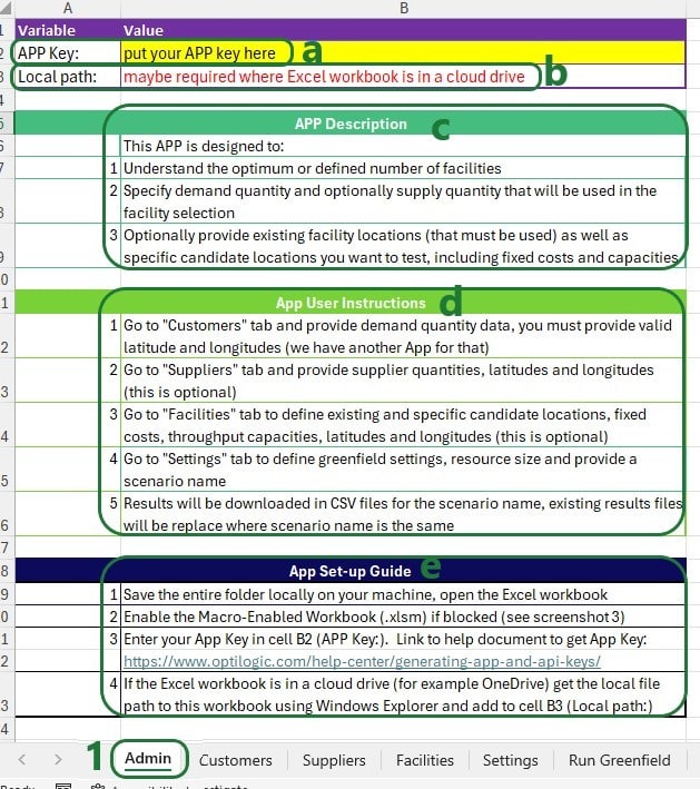 App Keys are used to authenticate the user from the Excel App on the Optilogic platform. To get an App Key that you can enter into your Excel Apps, see this Help Center Article on Generating App and API Keys. During the first run of an App, the App Key will be copied from the cell it is entered into to an app.key file in the same folder as the Excel .xlsm file, and it will be removed from the worksheet. This is done by using the Manage_App_Key Sub procedure described in the “Optilogic.bas VBA Module” section above. User can then keep running the App without having to enter the App Key again unless the workbook or app.key file is moved elsewhere.