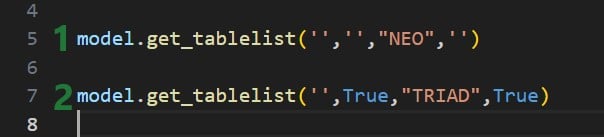 The next screenshot shows 2 examples of using the get_tablelist function of the FrogModel module: