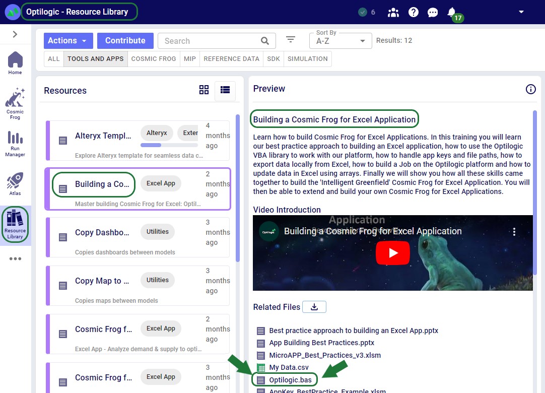 There are several Cosmic Frog for Excel Applications that have been developed by Optilogic available in the Resource Library. Links to these and a short description of each of them can be found in the penultimate section “Apps Available in the Resource Library” of this documentation.