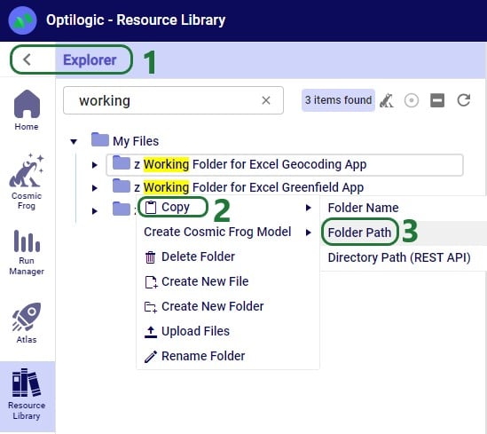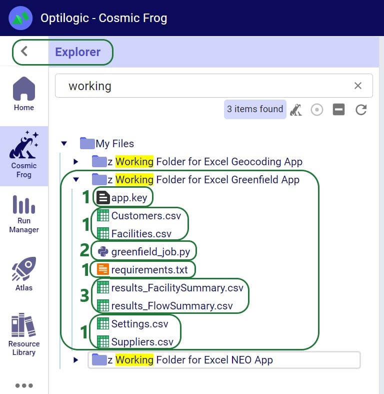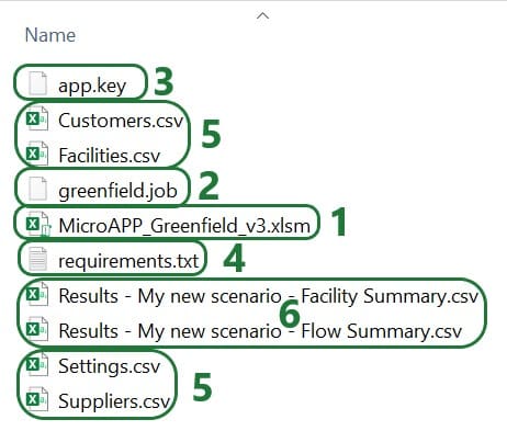 On the Optilogic platform, a working folder is created by the Run Greenfield Macro. This folder is called “z Working Folder for Excel Greenfield App”. After running the Greenfield App, we can see following files in here: