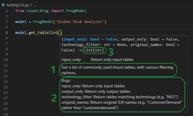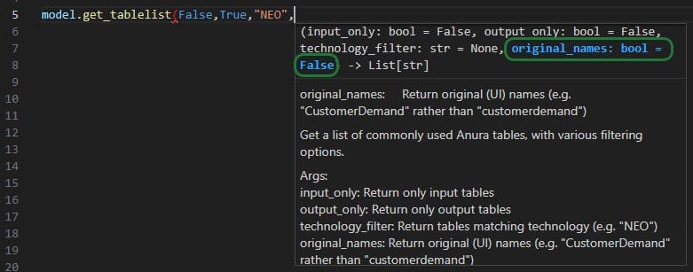 As you type the arguments for the function, the argument that you are on and the expected format (e.g. bool for a Boolean, str for string, etc.) will be in blue font and a description of this specific argument appears above the function description (e.g. above box 1 in the above screenshot). In the screenshot above we are on the first argument input_only which requires a Boolean as input and will be set to False by default if the argument is not specified. In the screenshot below we are on the fourth argument (original_names) which is now in blue font; its default is also False, and the argument description above the function description has changed now to reflect the fourth argument: