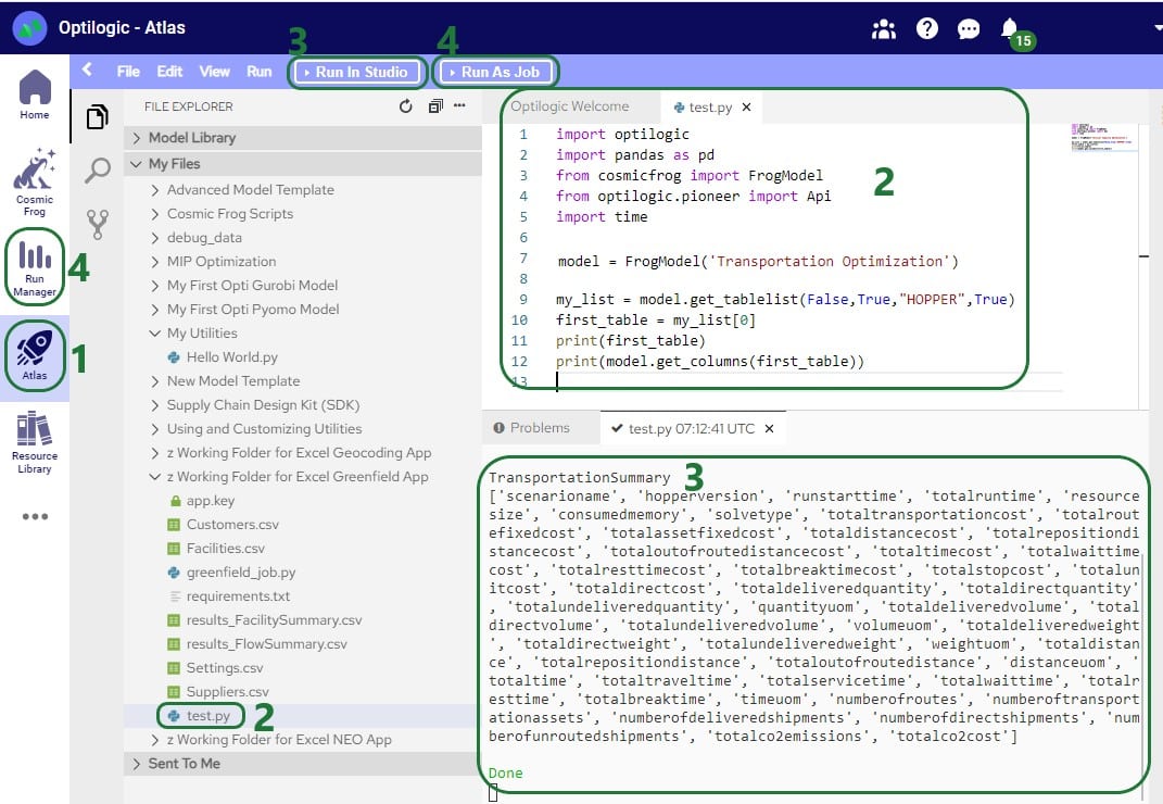 As mentioned above, you can also use Atlas on the Optilogic platform to create and run Python scripts. One drawback here is that it currently does not have code completion features like IntelliSense in Visual Studio Code.