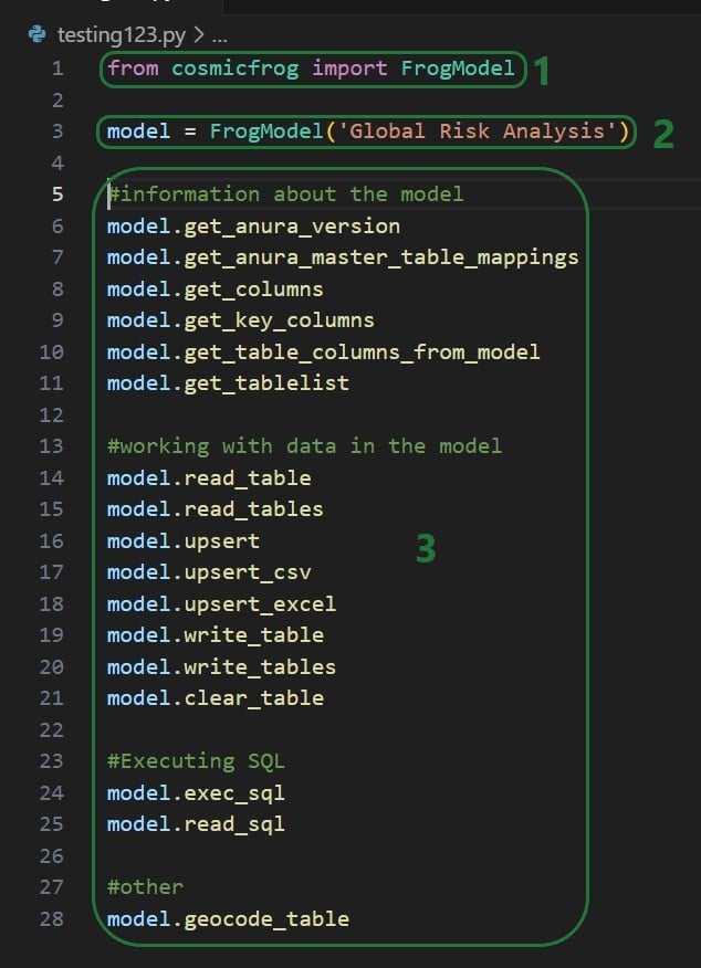 A great resource on how to write Python scripts for Cosmic Frog models is this “Scripting with Cosmic Frog” video. In this video, the cosmicfrog Python library, which adds specific functionality to the existing Python features to work with Cosmic Frog models, is covered in some detail already. The next set of screenshots will show an example using a Python script named testing123.py on our local set-up. The first screenshot shows a list of functions available from the cosmicfrog Python library: