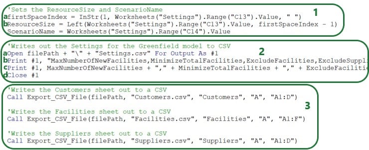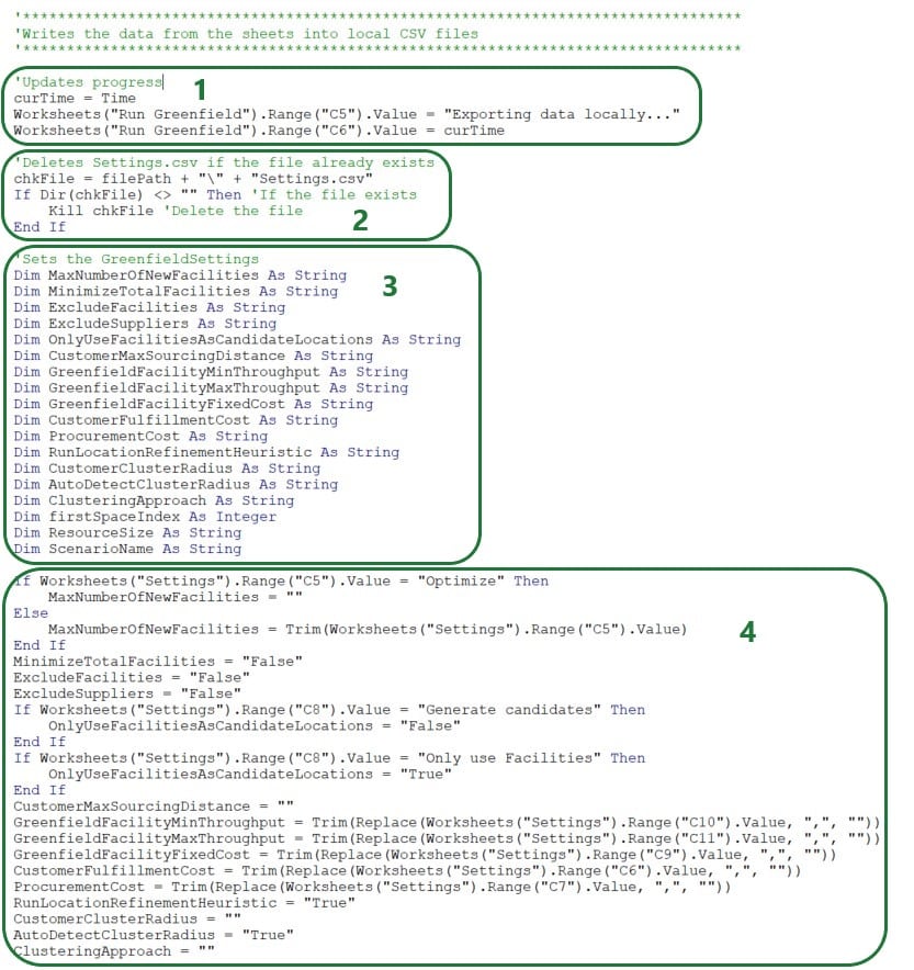 Parts of the Excel Macro and Python .job file will be different from App to App based on the App’s purpose, but a lot of the content will be the same or similar. In this section we will step through the Macro that is behind the Run Greenfield button in the Cosmic Frog for Excel Greenfield App that is included in the “Building a Cosmic Frog for Excel Application” resource, where it will be explained what is happening at a high level each step of the way and mention if this part is likely to be different and in need of editing for other Apps or if it would typically stay the same across most Apps. After stepping through this Excel Macro in this section, we will the same for the Greenfield.job file in the next section.