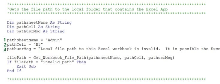 This code can be left as is for other Apps if there is an Admin worksheet (the variable pathsheetName indicated with 1 in screenshot above) where in cell B3 the file path (the variable pathCell indicated with 2 in screenshot above) can be specified. Of course, the worksheet name and cell can be updated if these are located elsewhere in the App. The message the user gets in this case (set as pathusrMsg indicated with 3 in the screenshot above) may need to be edited accordingly too.