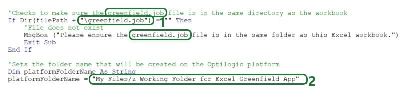 This App has a greenfield.job file associated with it that contains the Python script which will be run on the Optilogic platform when the App is run. The next piece of code checks that this greenfield.job file is saved in the same location as the Excel App, and it also sets the name of the folder to be created on the Optilogic platform where files will get uploaded to: