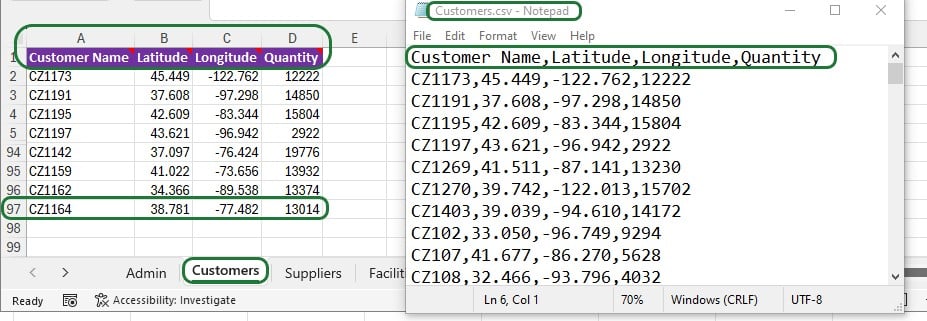 Looking in the Greenfield App on the Customers worksheet we see that this means that the Customer Name (column A), Latitude (column B), Longitude (column C), and Quantity (column D) columns will be exported. The Customers.csv file will contain the column names on the first row, plus 96 rows with data as the last populated row is row 97. Here follows a screenshot showing the Customers worksheet in the Excel App (rows 6-93 hidden) and the first 11 lines in the Customers.csv file that was exported while running the Greenfield App: