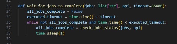 The following screenshot shows the next snippet of code that defines a function called wait_for_jobs_to_complete. It uses the check_job_status to periodically check if the job is done, and once done, moves onto the next piece of code. Again, this can be kept as is for other Apps.