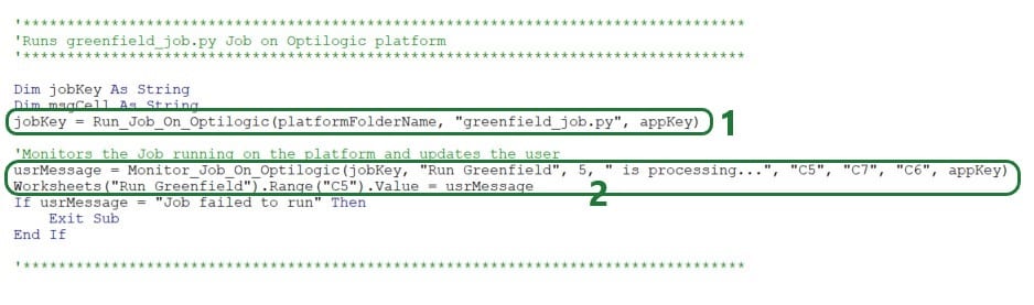 The next bit of code uses 2 more of the Optilogic.bas VBA module functions to run and monitor the Python job on the Optilogic platform: