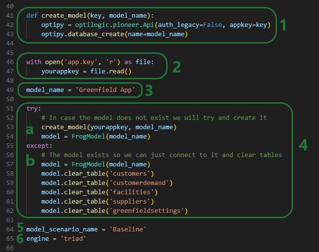 This first piece of code takes care of importing several python libraries and modules (optilogic, pandas, time; lines 1, 2, and 5). There is another library, cosmicfrog, that is imported through the requirements.txt file that has been discussed before in the section titled “Python Job File and requirements.txt”. Modules from these libraries are imported here as well (FrogModel from cosmicfrog on line 3 and pioneer.API from optilogic on line 4). Now the functionality of these libraries and their modules can be used throughout the code of the script that follows. The optilogic and cosmicfrog libraries are developed by Optilogic and contain specific functionality to work with Cosmic Frog models (e.g. the functions discussed in the section titled “Working with Python Locally” above and on the Optilogic platform.