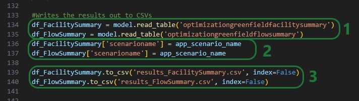 It is very dependent on the App that you are building how much of the above code you can use as is, but the concepts of reading csv files, renaming, and dropping columns as needed and writing tables into the Cosmic Frog model will be frequently used. The following piece of code also writes the Facilities and Suppliers data into the Cosmic Frog tables. Again, the concepts used here will be useful for other Apps too, it may just not be exactly the same depending on the App and the tables that are being written to: