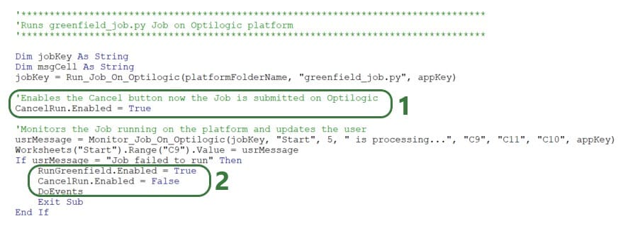 The next screenshot shows the addition of code to enable the Cancel button once the Job has been uploaded to the Optilogic platform: