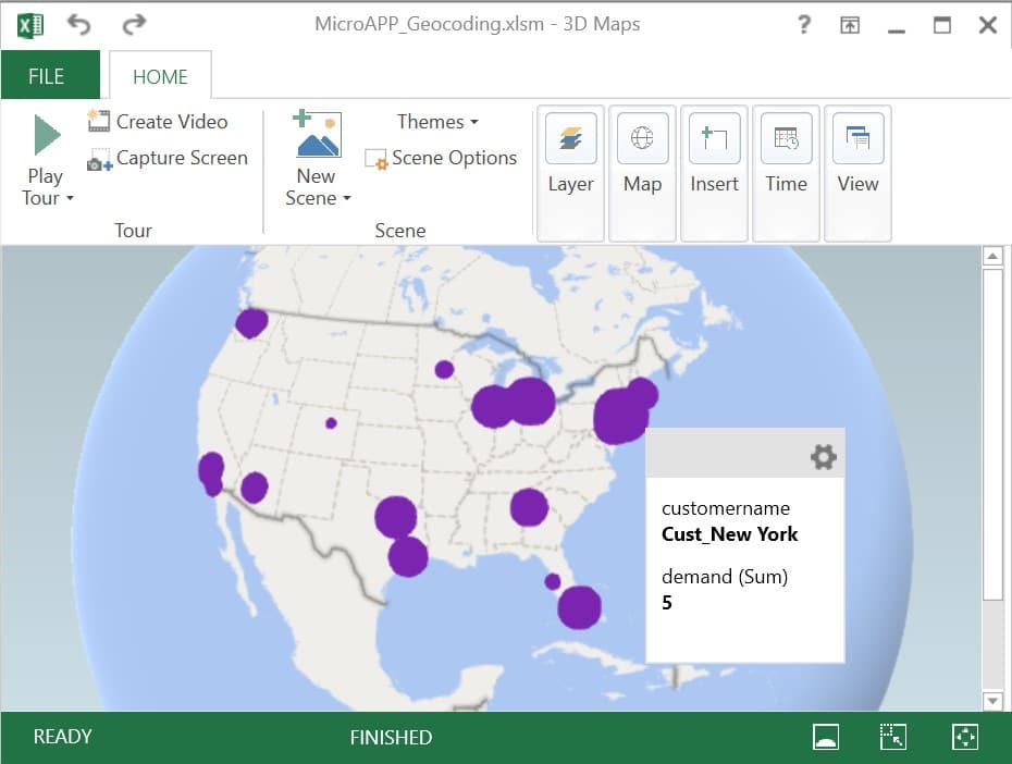 The Cosmic Frog for Excel – Geocoding App in the Resource Library uses Excel 3D Maps to visualize customer locations that the App has geocoded on a map: