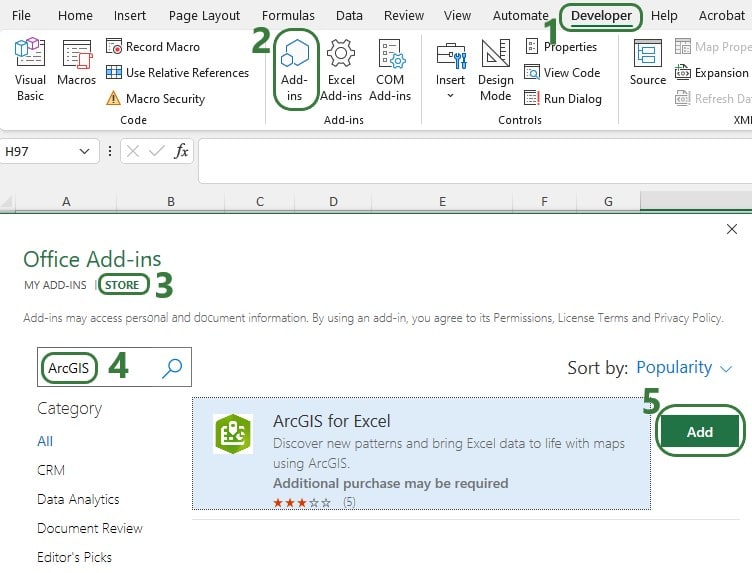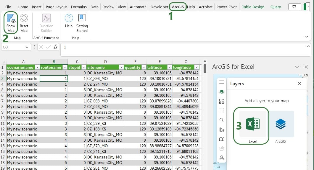 A good option to for example visualize Hopper (= transportation optimization) routes on a map is the ArcGIS Excel Add-in. If you do not have the add-in, you can get it from within Excel as follows: