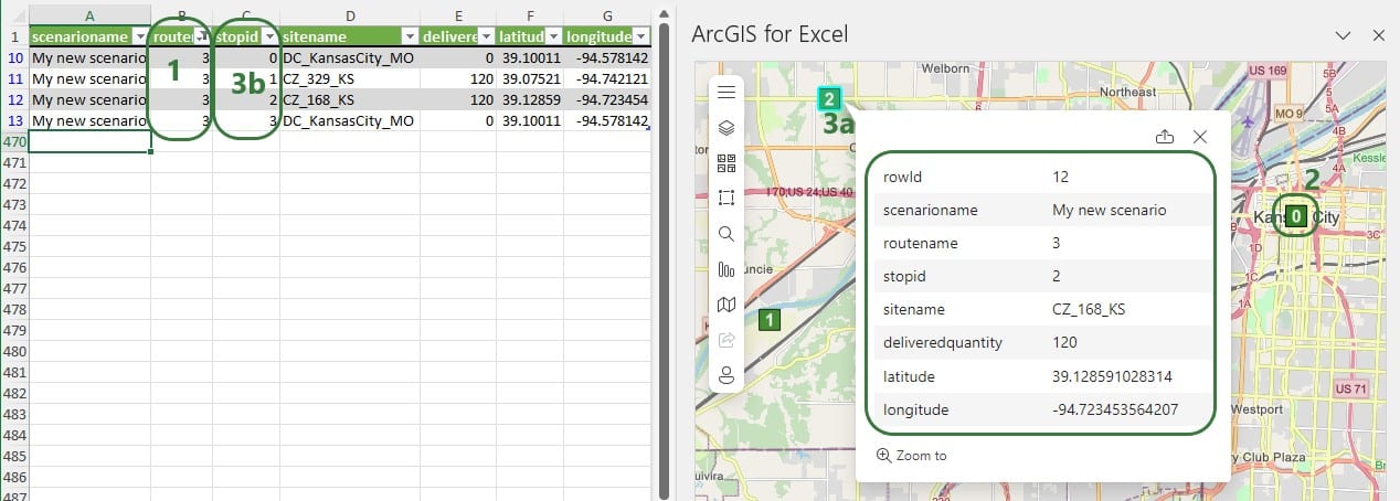 Note that for Hopper outputs with multiple routes, we now need to filter both the worksheet with the Stops information and the worksheet with the Segments information for the same route(s) to synchronize them. A better solution is to bring the stopID and Delivered Quantity information from the Stops output into the Segments output, so we only have 1 worksheet with all the information needed and both layers are generated from the same data. Then filtering this set of data will update both layers simultaneously.
