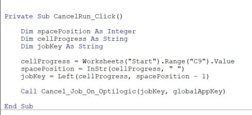 This code gets the Job Key (unique identifier of the Job) from cell C9 on the Start worksheet and then uses a new function added to the Optilogic.bas VBA module that is named Cancel_Job_On_Optilogic. This function takes 2 arguments: the Job Key to identify the run that needs to be cancelled and the App Key to authenticate the user on the Optilogic platform.