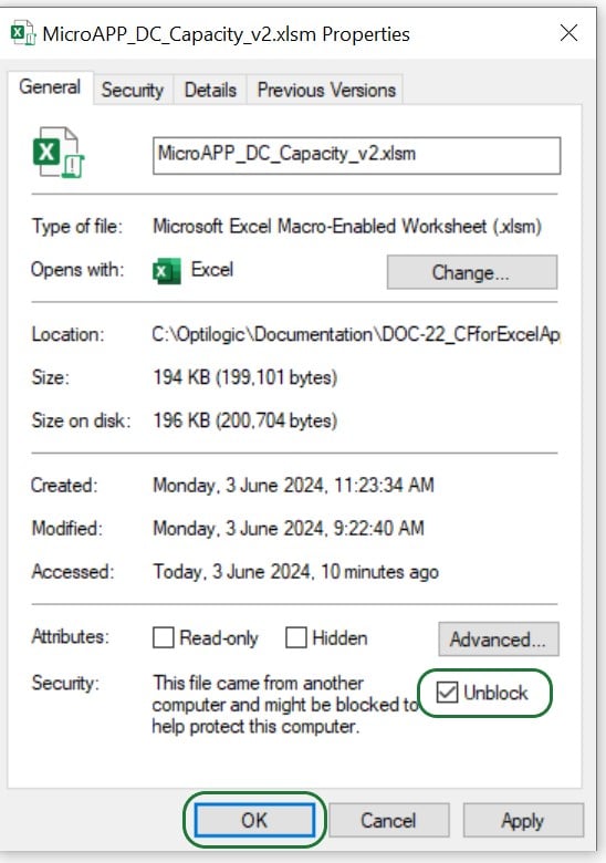 At the bottom in the General tab, check the Unblock checkbox and then click on OK.