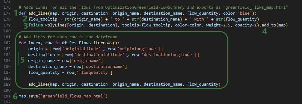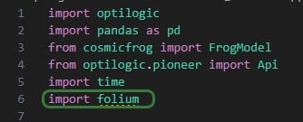 Here, we will discuss a Python library called folium, which gives users the ability to create maps that can show flows, tooltips, and has options to customize/auto-size location shapes and flow lines. We will use the example of the Cosmic Frog for Excel – Greenfield App (version 6) again where maps are created as .html files as part of the greenfield_job.py Python script that runs on the Optilogic platform. They are then downloaded as part of the results and from within Excel, users can click on buttons to show flows or customers which then opens the .html files in user’s default browser. We will focus on the differences with version 3 of the Greenfield App that are related to maps and folium. We will discuss the changes/addition to both the VBA code in the Excel Run Greenfield Macro and the additions to greenfield_job.py. First up in the VBA code, we need to add folium to the requirements.txt file so that the Python script can make use of the library once it is uploaded to the Optilogic platform: