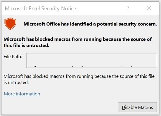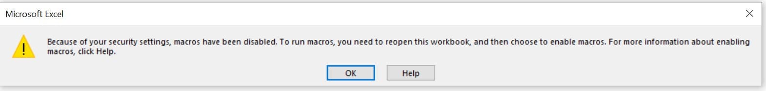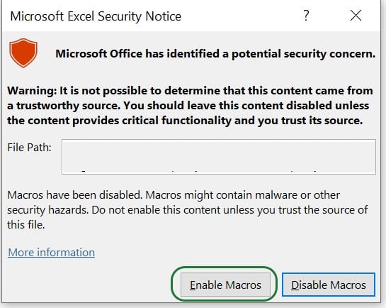 Now, when you open the .xlsm file again, you have the option to Enable Macros, do so by clicking on the button. From now on, you will not need to repeat any of these steps when closing and reopening the .xlsm file; Macros will work fine.