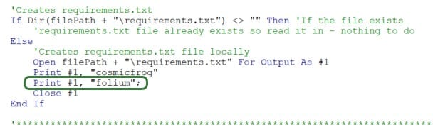 To do so, a line to the VBA code is added to write “folium” into requirements.txt.
