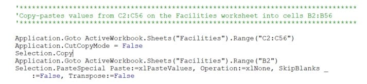 Note that throughout the Macro you will see text in green font. These are comments to describe what the code is doing and are not code that is executed when running the Macro. You can add comments by simply starting the line with a single quote and then typing your comment. Comments can be very helpful for less experienced users to understand what the VBA code is doing.