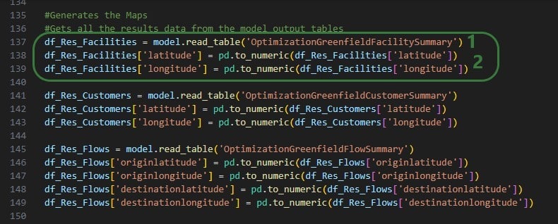 First, at the beginning of the script, we need to add “import folium” (line 6), so that the library’s functionality can be used throughout the script. Next, the 3 Greenfield output tables that are used to create the 3 maps are read in, and a few data type changes are made to get the data ready for mapping: