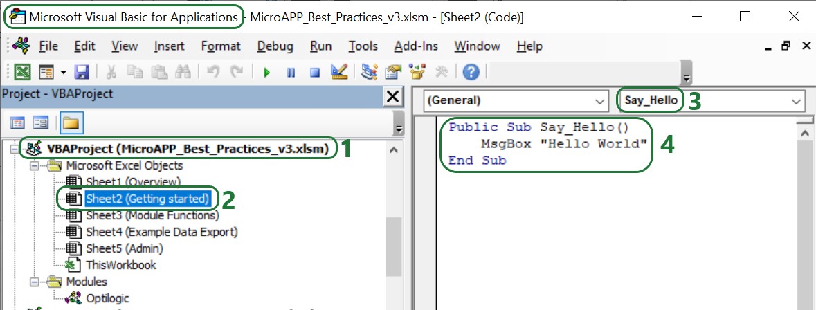 It is possible to add custom modules to VBA in which Sub procedures (“Subs”) and functions to perform specific tasks have been pre-defined and can be called in the rest of the VBA code used in the workbook where the module has been imported into. Optilogic has created such a module, called Optilogic.bas. This module provides 8 standard functions for integration into the Optilogic platform.